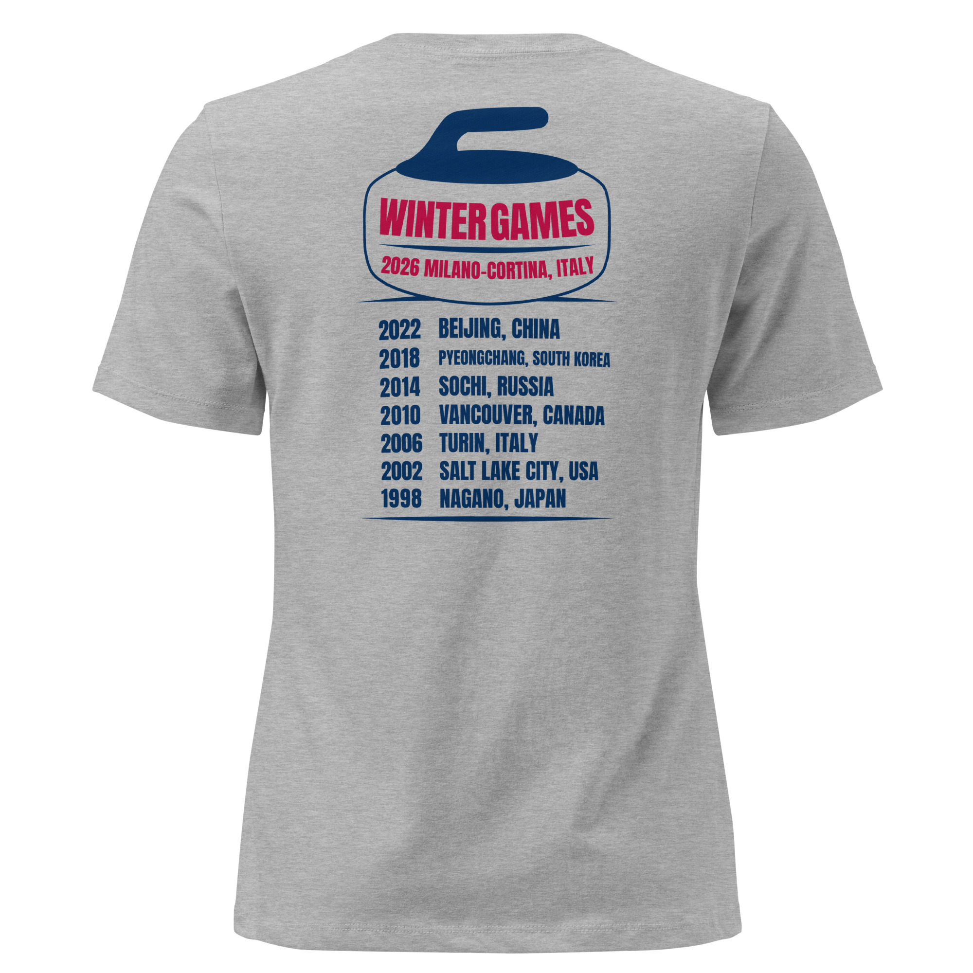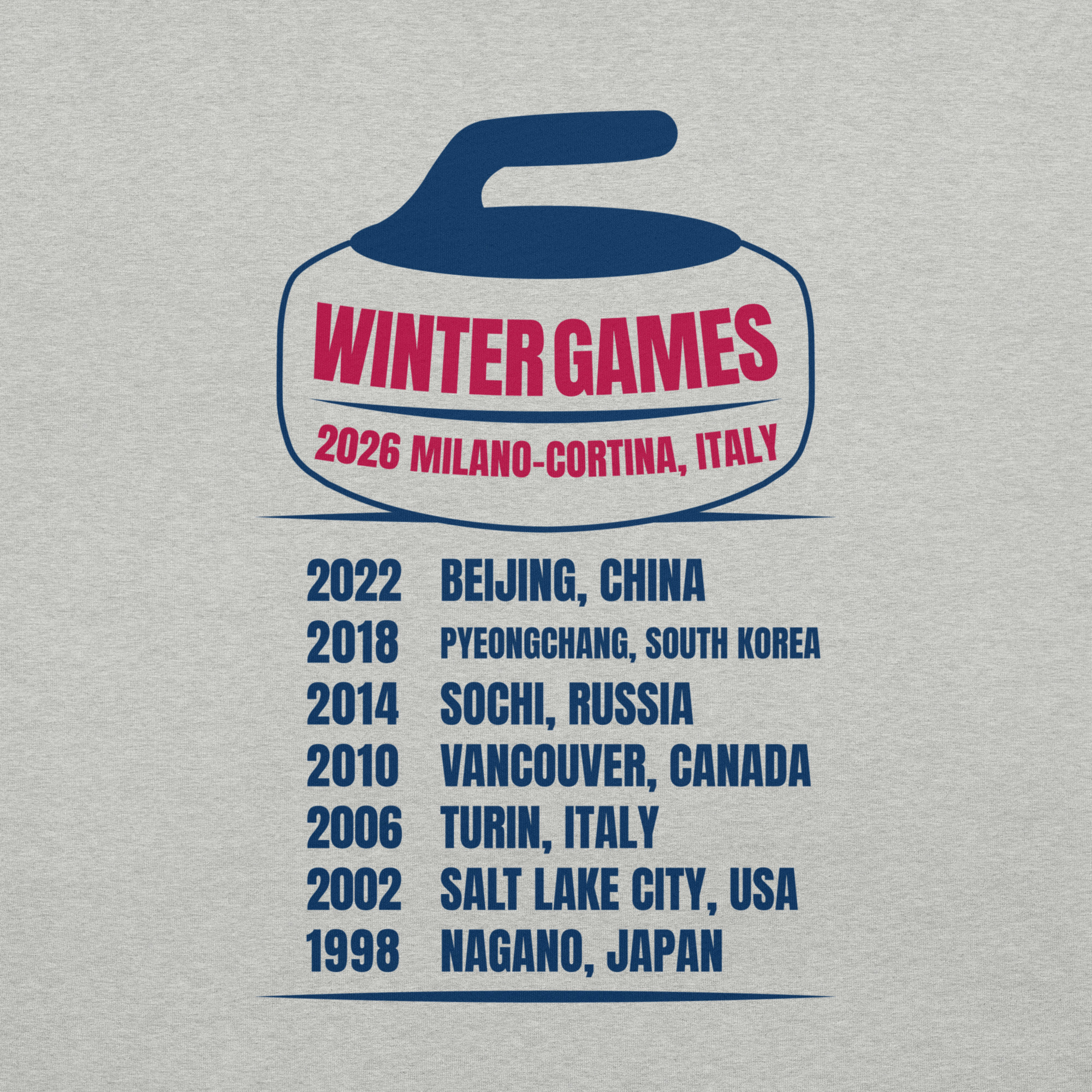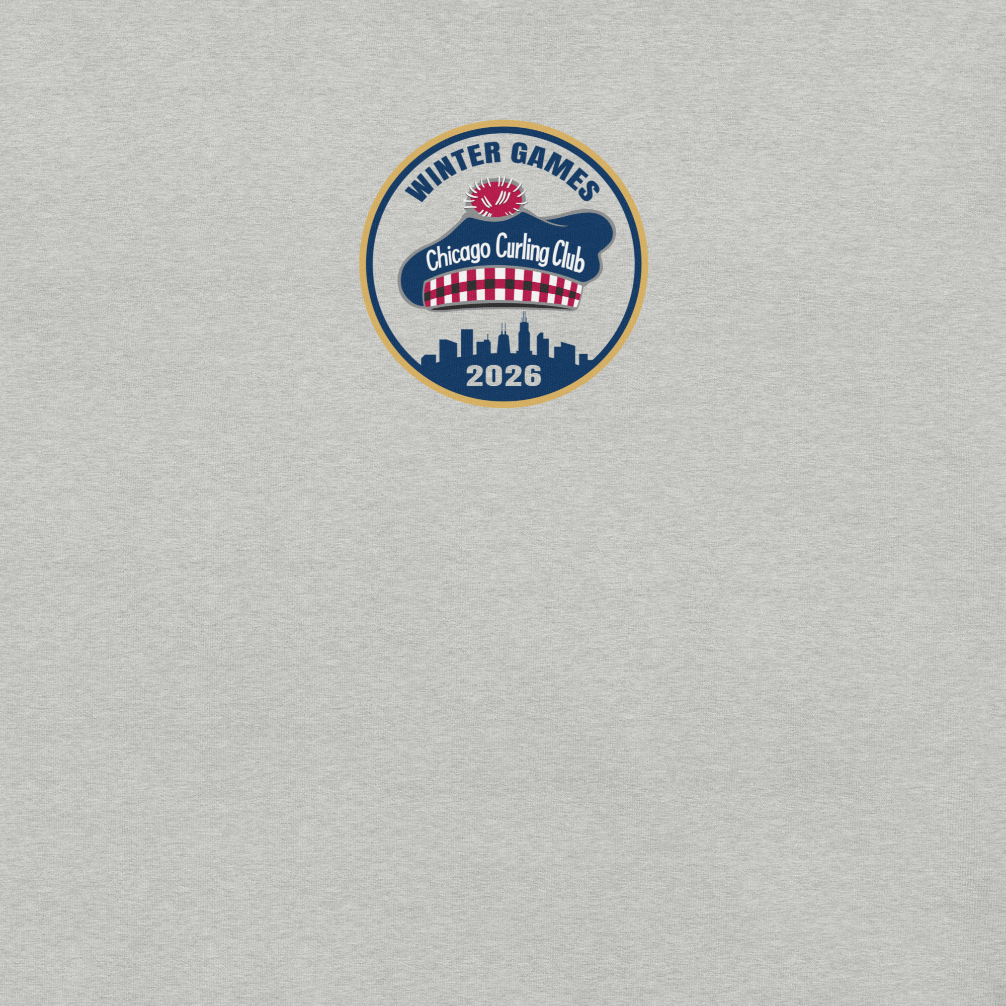 Created to celebrate the 2026 Winter Games, this shirt honors curling’s complete Olympic history. The front features the Chicago Curling Club logo encircled in gold, while the back highlights the 2026 host and every year curling has appeared on the Olympic stage. A tribute to the sport we love and the community it brings together.